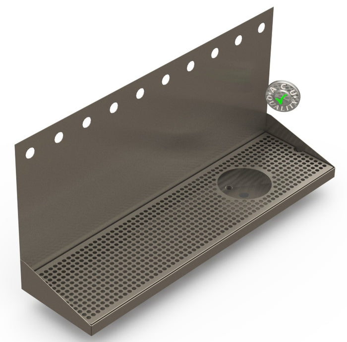 The wall mount with right drain and rinser hole (WMD) style wall mounts are designed to mount to any suitable vertical surface and can be configured for multiple beer taps. Wall Mounts are made of 18 Stainless Steel in #4 brushed finish. The front edge of tray is hemmed for reinforcement. The corners and seams are welded and ground to a brushed finish. All exposed edges are deburred smooth for safety and appearances. Each tray comes with a standard 18 ga. perforated screen. Drains are 1 1/2" long, 1/2" NPT Pipe Thread. Angled bottom for drainage.