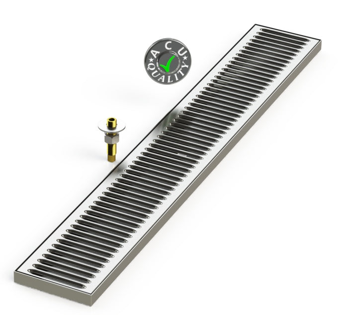 The SMD (Surface Mount with Drain) style drip trays are designed to mount to the top of any suitable surface with a drain hole drilled through. Trays are secured to surface using supplied hardware. Drip Trays are made of 18 ga. Stainless Steel in #4 brushed. The corners and seams are welded and ground to a brushed finish. All exposed edges are deburred smooth for safety and appearances. Each tray comes with a standard 20 ga. louvered screen. Drain tubes are 5/8-18 x 3" brass and secured to welded female drain fitting.