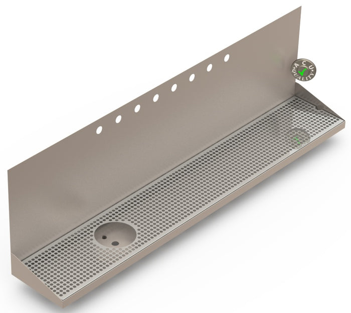 The WMD-style wall mounts are designed to mount to any suitable vertical surface and can be configured for multiple beer taps. The front edge of the tray is hemmed for reinforcement. All exposed edges are deburred smooth for safety and appearances. Each tray is available with a standard 18 gauge perforated screen. Drains are 1 1/2" long, 1/2" NPT Pipe Thread. Angled bottom for drainage.