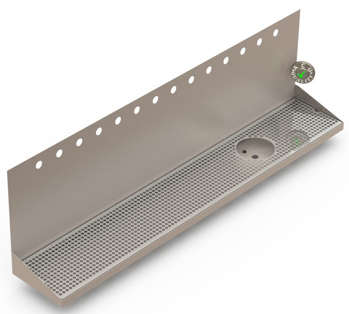 The WMD-style wall mounts are designed to mount to any suitable vertical surface and can be configured for multiple beer taps. The front edge of the tray is hemmed for reinforcement. All exposed edges are deburred smooth for safety and appearances. Each tray is available with a standard 18 gauge perforated screen. Drains are 1 1/2" long, 1/2" NPT Pipe Thread. Angled bottom for drainage.