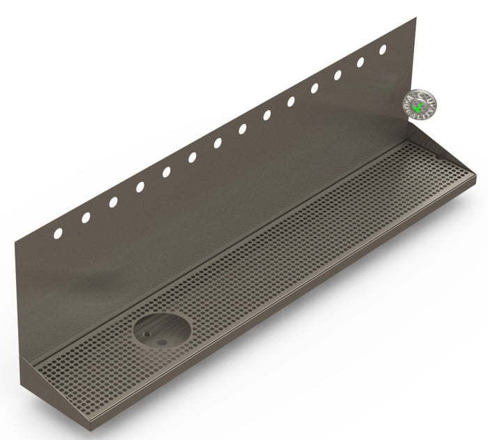 The wall mount with drain and rinser hole (WMD) style wall mounts are designed to mount to any suitable vertical surface and can be configured for multiple beer taps. Wall Mounts are made of 18 gauge Stainless Steel in #4 brushed finish. The front edge of the tray is hemmed for reinforcement. The corners and seams are welded and ground to a brushed finish. All exposed edges are deburred smooth for safety and appearances. Each tray comes with a standard 18 gauge perforated screen. Drains are 1 1/2" long, 1/2" NPT Pipe Thread. Angled bottom for drainage.
