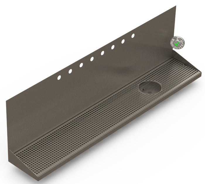 The wall mount with drain and rinser hole (WMD) style wall mounts are designed to mount to any suitable vertical surface and can be configured for multiple beer taps. Wall Mounts are made of 18 gauge Stainless Steel in #4 brushed finish. The front edge of the tray is hemmed for reinforcement. The corners and seams are welded and ground to a brushed finish. All exposed edges are deburred smooth for safety and appearances. Each tray comes with a standard 18 gauge perforated screen. Drains are 1 1/2" long, 1/2" NPT Pipe Thread. Angled bottom for drainage.