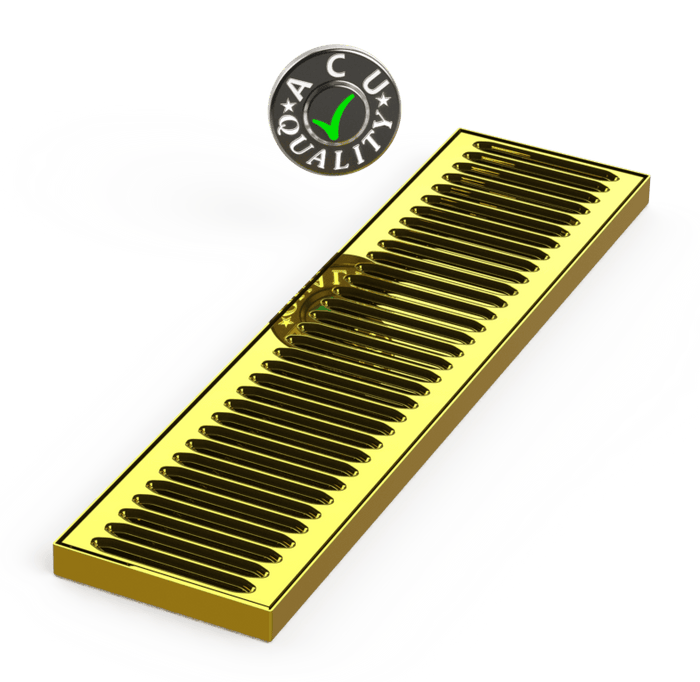 The SM (Surface Mount) style drip trays are designed to sit on the top of any suitable surface. Drip Trays are made of 16 GA. Brass in #8 finish. The corners and seams are welded and ground to a brushed finish. All exposed edges are deburred smooth for safety and appearances. Each tray comes with a standard 20 GA. louvered screen.