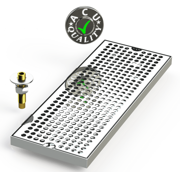 Trays are secured to surface using supplied hardware. Drip Trays are made of 18 ga. Stainless Steel in #8 mirror finish
