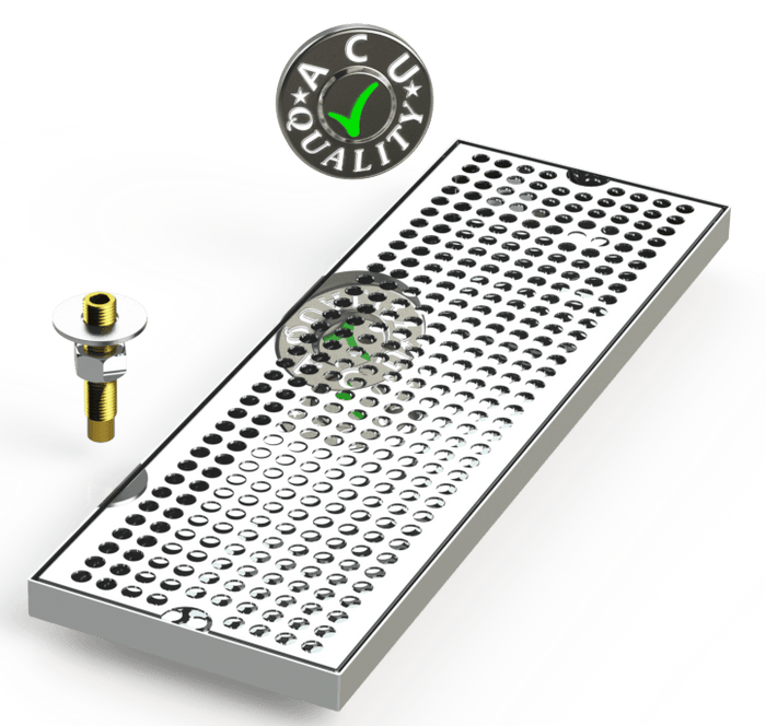 The corners and seams are welded and ground to a polished (mirror) finish. All exposed edges are deburred smooth for safety and appearances. Each tray is available with a standard 18 ga. perforated screen or a custom 20 ga. louvered screen. Drain tubes are 5/8-18 x 3" brass and secured to welded female drain fitting.