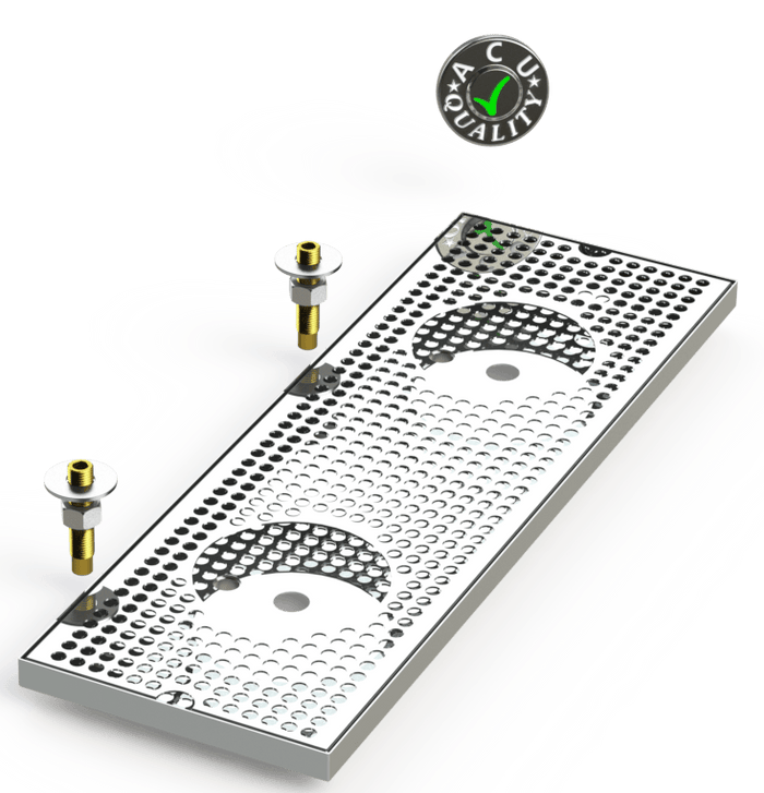 Trays are secured to the surface using supplied hardware. Drip Trays are made of 18 ga. Stainless Steel in #8 mirror finish