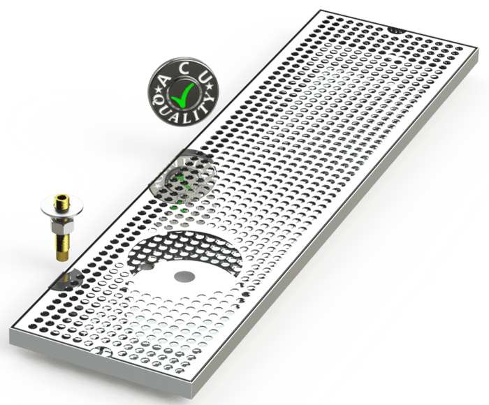 Trays are secured to the surface using supplied hardware. Drip Trays are made of 18 ga. Stainless Steel in #8 mirror finish