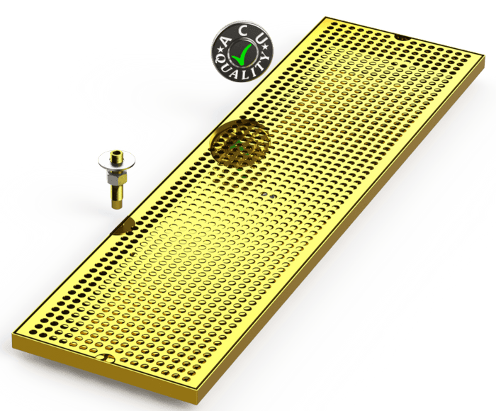 Trays are secured to the surface using supplied hardware. Drip Trays are made of 16 ga. Brass in #8 mirror finish