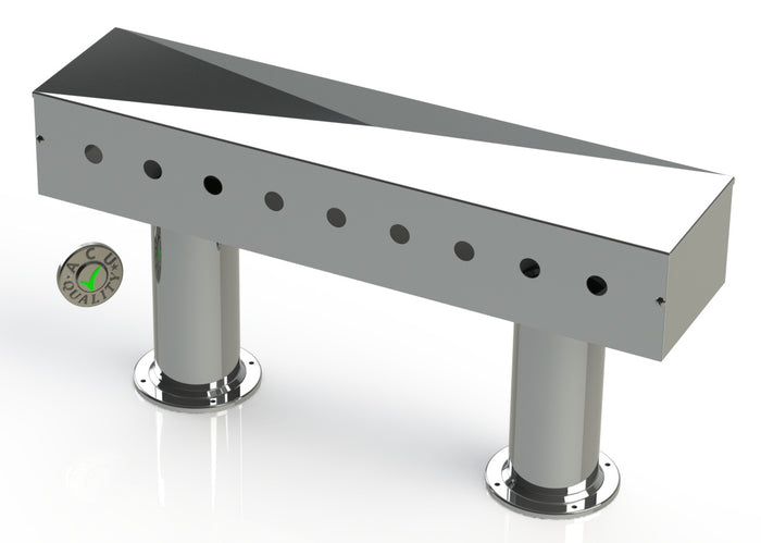 T-Towers are designed to mount to one or more pedestals. Our Pedestals are 10" tall. T-Towers are made of 18 Ga. Stainless Steel in #8 Mirror Finish. The removable faceplate is used to attach beer lines as easily as possible. T-Towers come with Styrofoam and Rubatex insulation and Neoprene gaskets to aid in keeping the product cold. Pedestals come in 4" diameter. The flanges on the pedestals are welded to the tubing thus eliminating dirt catches and producing a smooth seamless joint. The flanges are press formed from a single piece of material and have 4 countersunk holes for mounting. We supply the metal housing for that the beer lines go into. We do not include or sell taps or beer lines. We supply the suppliers of the Beer and Restaurant Industry with the finest stainless steel metal products since 1959.