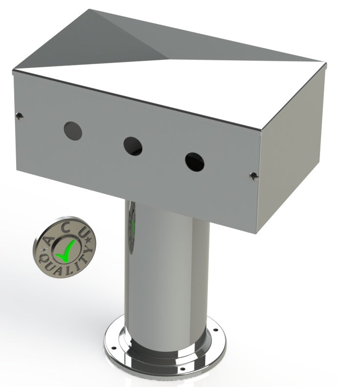 T-Towers are designed to mount to one or more pedestals. Our Pedestals are 10" tall. T-Towers are made of 18 Ga. Stainless Steel in #8 Mirror Finish. The removable faceplate is used to attach beer lines as easily as possible. T-Towers come with Styrofoam and Rubatex insulation and Neoprene gaskets to aid in keeping the product cold. Pedestals come in 4" diameter. The flanges on the pedestals are welded to the tubing thus eliminating dirt catches and producing a smooth seamless joint. The flanges are press formed from a single piece of material and have 4 countersunk holes for mounting. We supply the metal housing for that the beer lines go into. We do not include or sell taps or beer lines. We supply the suppliers of the Beer and Restaurant Industry with the finest stainless steel metal products since 1959.