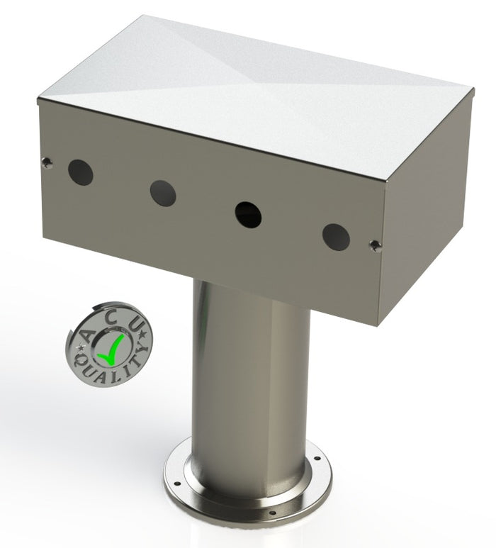 T-Towers are designed to mount to one or more pedestals. Our Pedestals are 10" tall. T-Towers are made of 18 ga. Stainless Steel in #4 brushed finish. The removable faceplate is used to attach beer lines as easily as possible. T-Towers come with Styrofoam and Rubatex insulation and Neoprene gaskets to aid in keeping the product cold. Pedestals come in 4" diameter. The flanges on the pedestals are welded to the tubing thus eliminating dirt catches and producing a smooth seamless joint. The flanges are press formed from a single piece of material and have 4 countersunk holes for mounting. We supply the metal housing for that the beer lines go into. We do not include or sell taps or beer lines. We supply the suppliers of the Beer and Restaurant Industry with the finest stainless steel metal products since 1959.