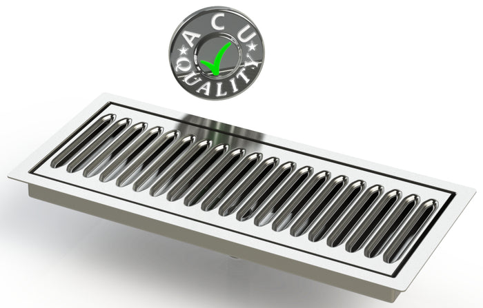 The Flush Mount with Drain (FMD) style drip trays are designed to mount flush to any surface with a relieved opening. Drip Trays are made of 18 ga. Stainless Steel in #4 brushed finish. The corners and seams are welded and ground to either a brushed or polished high finish. All exposed edges are deburred smooth for safety and appearances. Each tray comes with a standard 20 ga. louvered screen. Drains are 1 1/2" long, 1/2" NPT Pipe Thread. Angled bottom for drainage. We supply the suppliers of Restaurant and Bar Equipment.