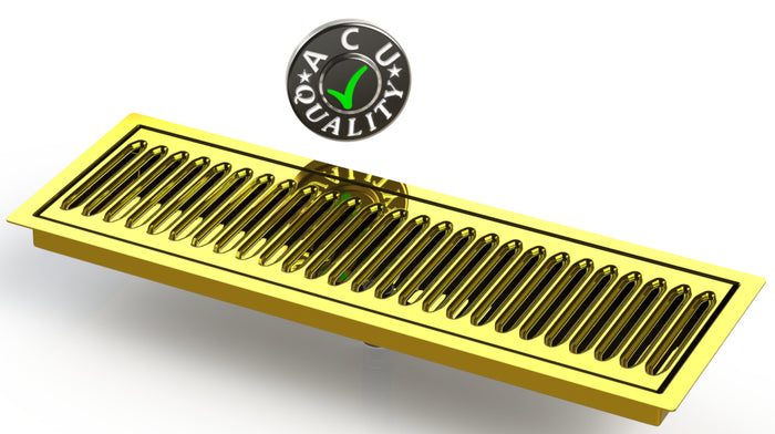 The FMD style drip tray is designed to mount flush to any surface with a relieved opening. Flush Mounts are made of 16 ga. brass in #8 Mirror finish. The corners and seams are welded and ground to either a brushed or polished high finish. All exposed edges are deburred smooth for safety and appearances. Each tray is available with a standard 20 ga. louvered screen. Drains are 1 1/2" long, 1/2" NPT Pipe Thread. This Flush Mount also has an angled bottom for drainage.