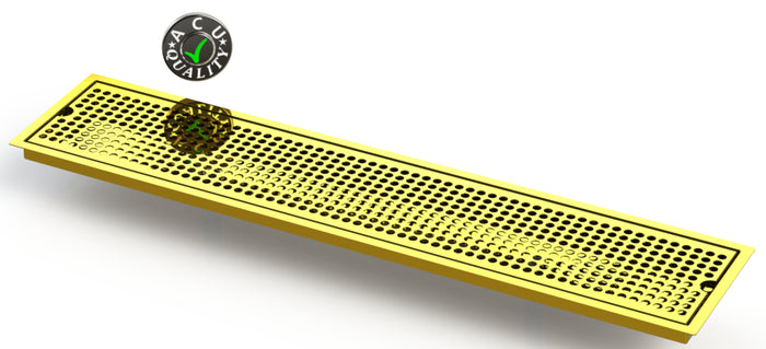 The FM-DD style drip tray is designed to mount flush to any surface with a relieved opening. Flush Mounts are made of 16 ga. brass in #8 Mirror finish. The corners and seams are welded and ground to either a brushed or polished high finish. All exposed edges are deburred smooth for safety and appearances. Each tray is available with a standard 18 ga. perforated screen. Drains are 1 1/2" long, 1/2" NPT Pipe Thread. This Flush Mount also has an angled bottom for drainage.