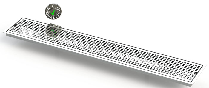 The FM-DD style drip tray is designed to mount flush to any surface with a relieved opening. Flush Mounts are made of 18 ga. Stainless Steel in #8 Mirror finish.The corners and seams are welded and ground to either a brushed or polished high finish. All exposed edges are deburred smooth for safety and appearances. Each tray is available with a standard 18 ga. perforated screen. Drains are 1 1/2" long, 1/2" NPT Pipe Thread. This Flush Mount also has an angled bottom for drainage.