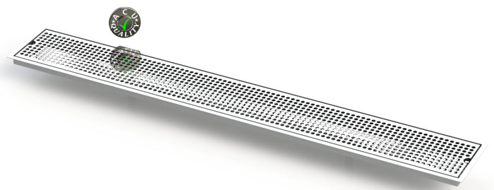 The FM-DD style drip tray is designed to mount flush to any surface with a relieved opening. Flush Mounts are made of 18 ga. Stainless Steel in #8 Mirror finish.The corners and seams are welded and ground to either a brushed or polished high finish. All exposed edges are deburred smooth for safety and appearances. Each tray is available with a standard 18 ga. perforated screen. Drains are 1 1/2" long, 1/2" NPT Pipe Thread. This Flush Mount also has an angled bottom for drainage.