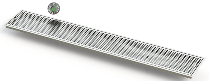 The Flush Mount with Double Drains (FM-DD) style drip trays is designed to mount flush to any surface with a relieved opening. Drip Trays are made of 18 ga. Stainless Steel in #4 brushed finish. The corners and seams are welded and ground to either a brushed or polished high finish. All exposed edges are deburred smooth for safety and appearances. Each tray comes with a standard 18 ga. perforated screen. Drains are 1 1/2" long, 1/2" NPT Pipe Thread. Angled bottom for drainage. We supply the suppliers of Restaurant and Bar Equipment.