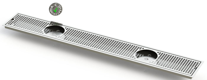 The Flush Mount with Double Drain and Double Rinser Holes style drip trays are designed to mount flush to any surface with a relieved opening. Drip Trays are made of 18 gauge Stainless Steel in #4 brushed finish. The corners and seams are welded and ground to either a brushed or polished high finish. All exposed edges are deburred smooth for safety and appearances. Each tray comes with a standard 18 gauge perforated screen. Drains are 1 1/2" long, 1/2" NPT Pipe Thread. Angled bottom for drainage. We supply the suppliers of Restaurant and Bar Equipment.