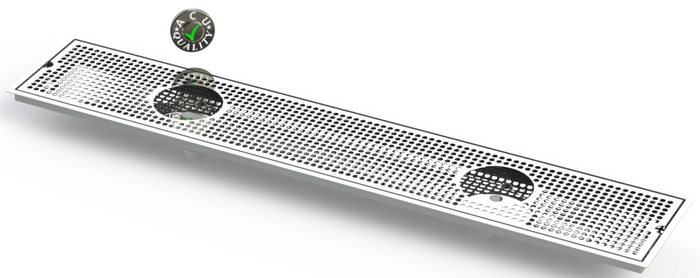 The Flush Mount with Double Drain and Double Rinser Holes style drip tray is designed to mount flush to any surface with a relieved opening. Flush Mounts are made of 18 gauge Stainless Steel in #8 Mirror finish. The corners and seams are welded and ground to either a brushed or polished high finish. All exposed edges are deburred smooth for safety and appearances. Each tray is available with a standard 18 gauge perforated screen. Drains are 1 1/2" long, 1/2" NPT Pipe Thread. This Flush Mount also has an angled bottom for drainage.