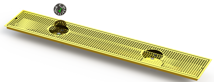 The Flush Mount with double drain and double rinser holes style drip tray is designed to mount flush to any surface with a relieved opening. Flush Mounts are made of 18 gauge brass in #8 Mirror finish. The corners and seams are welded and ground to either a brushed or polished high finish. All exposed edges are deburred smooth for safety and appearances. Each tray is available with a standard 18 gauge perforated screen. Drains are 1 1/2" long, 1/2" NPT Pipe Thread. This Flush Mount also has an angled bottom for drainage.