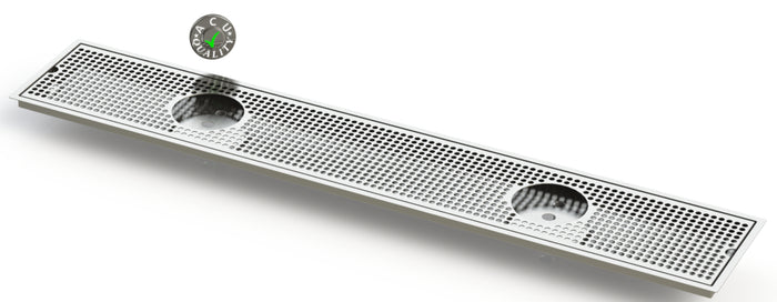 The Flush Mount with Double Drain and Double Rinser Holes style drip trays are designed to mount flush to any surface with a relieved opening. Drip Trays are made of 18 gauge Stainless Steel in a #4 brushed finish. The corners and seams are welded and ground to either a brushed or polished high finish. All exposed edges are deburred smooth for safety and appearance. Each tray comes with a standard 18-gauge perforated screen. Drains are 1 1/2" long, 1/2" NPT Pipe Thread. Angled bottom for drainage. We supply the suppliers of Restaurant and Bar Equipment.