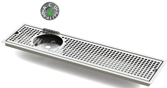 The Flush Mount with Left Drain and Rinser Hole style drip trays are designed to mount flush to any surface with a relieved opening. Drip Trays are made of 18 gauge Stainless Steel in #4 brushed finish. The corners and seams are welded and ground to either a brushed or polished high finish. All exposed edges are deburred smooth for safety and appearances. Each tray comes with a standard 18 gauge perforated screen. Drains are 1 1/2" long, 1/2" NPT Pipe Thread. Angled bottom for drainage. We supply the suppliers of Restaurant and Bar Equipment.