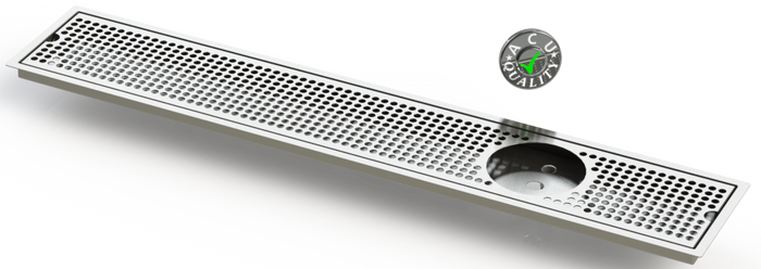The Flush Mount with Right Drain and Rinser Hole style drip trays are designed to mount flush to any surface with a relieved opening. Drip Trays are made of 18 gauge Stainless Steel in #4 brushed finish. The corners and seams are welded and ground to either a brushed or polished high finish. All exposed edges are deburred smooth for safety and appearances. Each tray comes with a standard 18 gauge perforated screen. Drains are 1 1/2" long, 1/2" NPT Pipe Thread. Angled bottom for drainage. We supply the suppliers of Restaurant and Bar Equipment.
