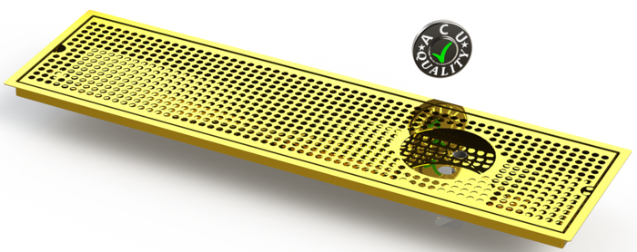 The Flush Mount with Right drain and rinser hole style drip tray is designed to mount flush to any surface with a relieved opening. Flush Mounts are made of 18 gauge brass in #8 Mirror finish. The corners and seams are welded and ground to either a brushed or polished high finish. All exposed edges are deburred smooth for safety and appearances. Each tray is available with a standard 18 gauge perforated screen. Drains are 1 1/2" long, 1/2" NPT Pipe Thread. This Flush Mount also has an angled bottom for drainage.
