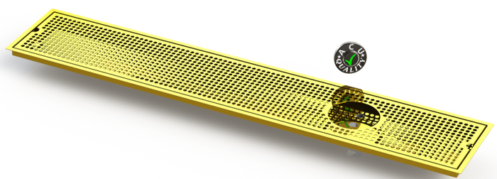 The Flush Mount with Right drain and rinser hole style drip tray is designed to mount flush to any surface with a relieved opening. Flush Mounts are made of 18 gauge brass in #8 Mirror finish. The corners and seams are welded and ground to either a brushed or polished high finish. All exposed edges are deburred smooth for safety and appearances. Each tray is available with a standard 18 gauge perforated screen. Drains are 1 1/2" long, 1/2" NPT Pipe Thread. This Flush Mount also has an angled bottom for drainage.