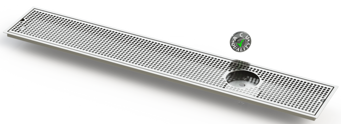 The Flush Mount with Right Drain and Rinser Hole style drip trays are designed to mount flush to any surface with a relieved opening. Drip Trays are made of 18 gauge Stainless Steel in #4 brushed finish. The corners and seams are welded and ground to either a brushed or polished high finish. All exposed edges are deburred smooth for safety and appearances. Each tray comes with a standard 18 gauge perforated screen. Drains are 1 1/2" long, 1/2" NPT Pipe Thread. Angled bottom for drainage. We supply the suppliers of Restaurant and Bar Equipment.