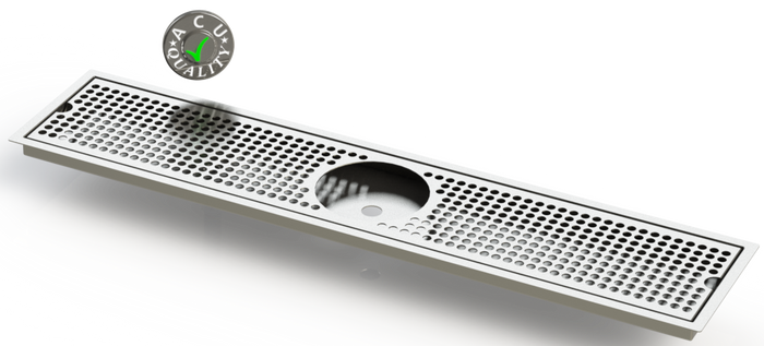 The Flush Mount with Rinser Hole and Offset Drain style drip trays are designed to mount flush to any surface with a relieved opening. Drip Trays are made of 18 gauge Stainless Steel in #4 brushed finish. The corners and seams are welded and ground to either a brushed or polished high finish. All exposed edges are deburred smooth for safety and appearances. Each tray comes with a standard 18 gauge perforated screen. Drains are 1 1/2" long, 1/2" NPT Pipe Thread. Angled bottom for drainage. We supply the suppliers of Restaurant and Bar Equipment.