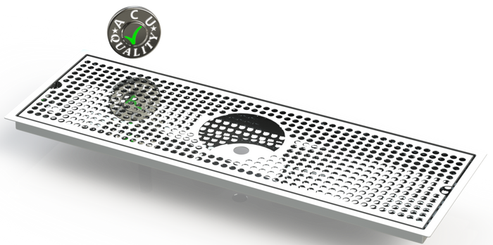 The Flush Mount with Rinser Hole and Offset Drain style drip tray is designed to mount flush to any surface with a relieved opening. Flush Mounts are made of 18 gauge Stainless Steel in #8 Mirror finish. The corners and seams are welded and ground to either a brushed or polished high finish. All exposed edges are deburred smooth for safety and appearances. Each tray is available with a standard 18 gauge perforated screen. Drains are 1 1/2" long, 1/2" NPT Pipe Thread. This Flush Mount also has an angled bottom for drainage.