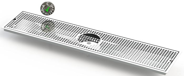 The Flush Mount with Rinser Hole and Offset Drain style drip tray is designed to mount flush to any surface with a relieved opening. Flush Mounts are made of 18 gauge Stainless Steel in #8 Mirror finish. The corners and seams are welded and ground to either a brushed or polished high finish. All exposed edges are deburred smooth for safety and appearances. Each tray is available with a standard 18 gauge perforated screen. Drains are 1 1/2" long, 1/2" NPT Pipe Thread. This Flush Mount also has an angled bottom for drainage.