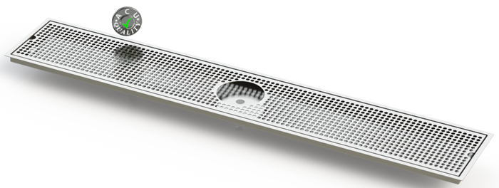 The Flush Mount with Rinser Hole and Offset Drain style drip trays are designed to mount flush to any surface with a relieved opening. Drip Trays are made of 18 gauge Stainless Steel in #4 brushed finish. The corners and seams are welded and ground to either a brushed or polished high finish. All exposed edges are deburred smooth for safety and appearances. Each tray comes with a standard 18 gauge perforated screen. Drains are 1 1/2" long, 1/2" NPT Pipe Thread. Angled bottom for drainage. We supply the suppliers of Restaurant and Bar Equipment.