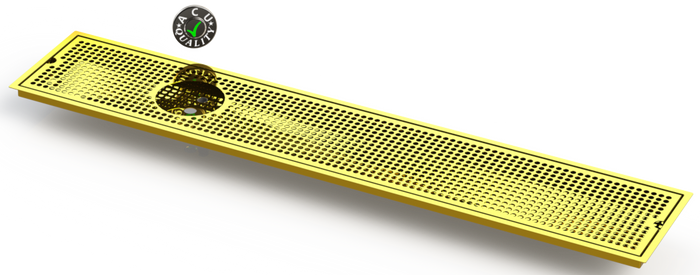 The Flush Mount with left drain and rinser hole style drip tray is designed to mount flush to any surface with a relieved opening. Flush Mounts are made of 18 gauge brass in #8 Mirror finish. The corners and seams are welded and ground to either a brushed or polished high finish. All exposed edges are deburred smooth for safety and appearances. Each tray is available with a standard 18 gauge perforated screen. Drains are 1 1/2" long, 1/2" NPT Pipe Thread. This Flush Mount also has an angled bottom for drainage.