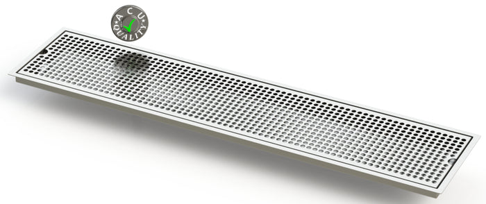 The Flush Mount with Drain (FMD) style drip trays are designed to mount flush to any surface with a relieved opening. Drip Trays are made of 18 ga. Stainless Steel in #4 brushed finish. The corners and seams are welded and ground to either a brushed or polished high finish. All exposed edges are deburred smooth for safety and appearances. Each tray comes with a standard 18 ga. perforated screen. Drains are 1 1/2" long, 1/2" NPT Pipe Thread. Angled bottom for drainage. We supply the suppliers of Restaurant and Bar Equipment.