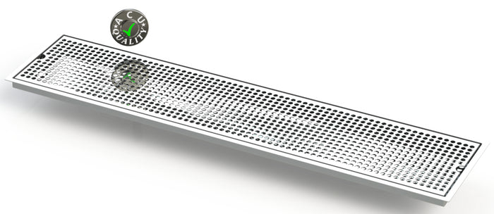 The FMD-style drip tray is designed to mount flush to any surface with a relieved opening. Flush Mounts are made of 18 ga. Stainless Steel in #8 Mirror finish. The corners and seams are welded and ground to a brushed or polished high finish. All exposed edges are deburred smooth for safety and appearance. Each tray is available with a standard 18 ga. perforated screen. Drains are 1 1/2" long, 1/2" NPT Pipe Thread. This Flush Mount also has an angled bottom for drainage.