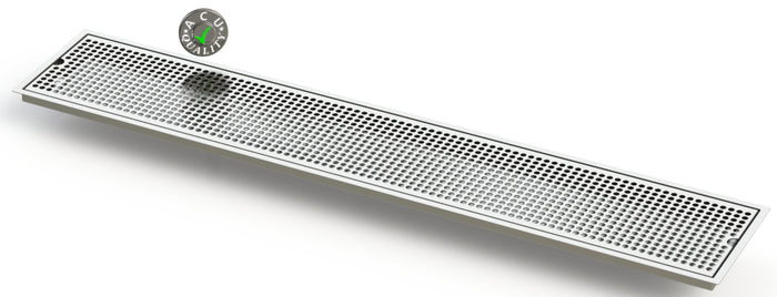 The Flush Mount with Drain (FMD) style drip trays are designed to mount flush to any surface with a relieved opening. Drip Trays are made of 18 ga. Stainless Steel in #4 brushed finish. The corners and seams are welded and ground to either a brushed or polished high finish. All exposed edges are deburred smooth for safety and appearances. Each tray comes with a standard 18 ga. perforated screen. Drains are 1 1/2" long, 1/2" NPT Pipe Thread. Angled bottom for drainage. We supply the suppliers of Restaurant and Bar Equipment.
