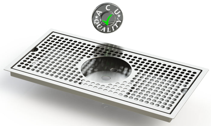 The Flush Mount with Drain and Rinser Hole style drip trays are designed to mount flush to any surface with a relieved opening. Drip Trays are made of 18 gauge. Stainless Steel in #4 brushed finish. The corners and seams are welded and ground to either a brushed or polished high finish. All exposed edges are deburred smooth for safety and appearances. Each tray comes with a standard 18 gauge. perforated screen. Drains are 1 1/2" long, 1/2" NPT Pipe Thread. Angled bottom for drainage. We supply the suppliers of Restaurant and Bar Equipment.