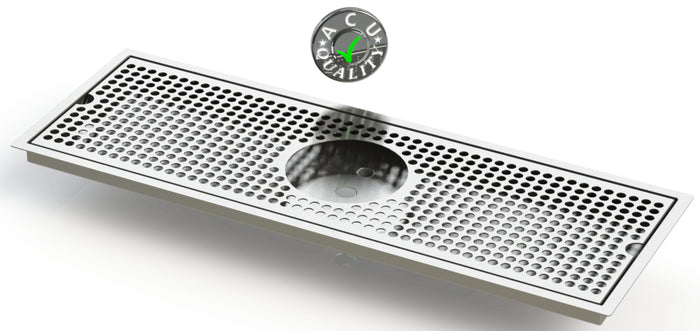 The Flush Mount with Drain and Rinser Hole style drip trays are designed to mount flush to any surface with a relieved opening. Drip Trays are made of 18 gauge. Stainless Steel in #4 brushed finish. The corners and seams are welded and ground to either a brushed or polished high finish. All exposed edges are deburred smooth for safety and appearances. Each tray comes with a standard 18 gauge. perforated screen. Drains are 1 1/2" long, 1/2" NPT Pipe Thread. Angled bottom for drainage. We supply the suppliers of Restaurant and Bar Equipment.