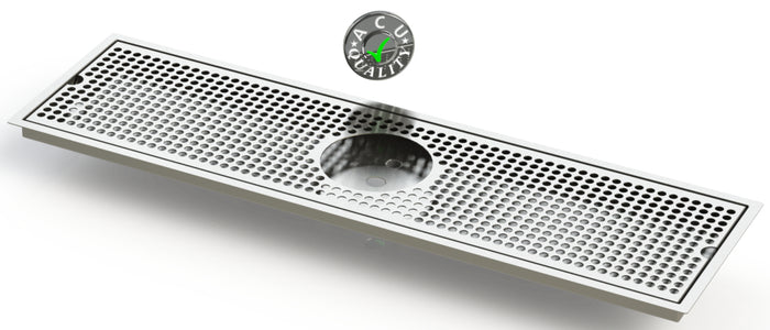 The Flush Mount with Drain and Rinser Hole style drip trays are designed to mount flush to any surface with a relieved opening. Drip Trays are made of 18 gauge. Stainless Steel in #4 brushed finish. The corners and seams are welded and ground to either a brushed or polished high finish. All exposed edges are deburred smooth for safety and appearance. Each tray comes with a standard 18 gauge. perforated screen. Drains are 1 1/2" long, 1/2" NPT Pipe Thread. Angled bottom for drainage. We supply the suppliers of Restaurant and Bar Equipment.