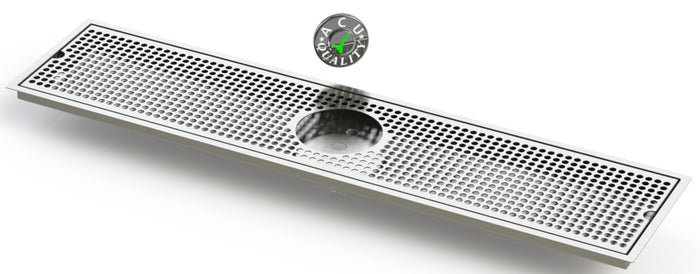 The Flush Mount with Drain and Rinser Hole style drip trays are designed to mount flush to any surface with a relieved opening. Drip Trays are made of 18 gauge. Stainless Steel in #4 brushed finish. The corners and seams are welded and ground to either a brushed or polished high finish. All exposed edges are deburred smooth for safety and appearances. Each tray comes with a standard 18 gauge. perforated screen. Drains are 1 1/2" long, 1/2" NPT Pipe Thread. Angled bottom for drainage. We supply the suppliers of Restaurant and Bar Equipment.