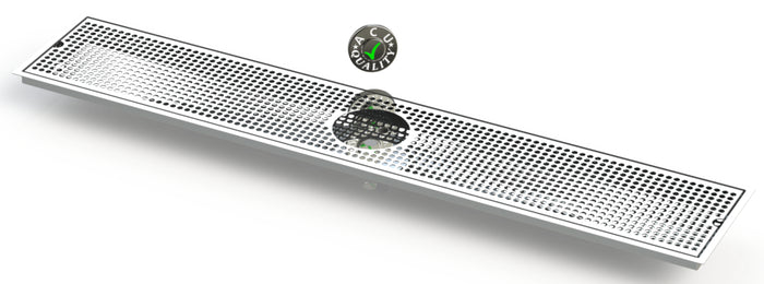 The Flush Mount with Drain and Rinser Hole style drip tray is designed to mount flush to any surface with a relieved opening. Flush Mounts are made of 18 gauge Stainless Steel in #8 Mirror finish. The corners and seams are welded and ground to either a brushed or polished high finish. All exposed edges are deburred smooth for safety and appearances. Each tray is available with a standard 18 gauge perforated screen. Drains are 1 1/2" long, 1/2" NPT Pipe Thread. This Flush Mount also has an angled bottom for drainage.